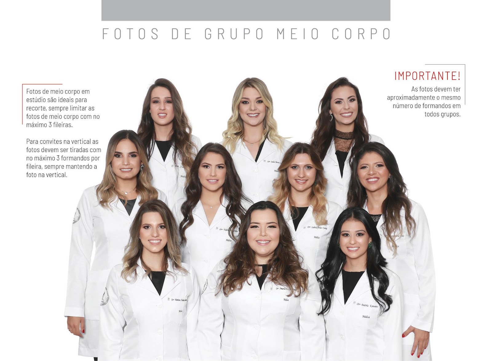 Se a ideia é dar mais destaque para a foto da turma, fazendo com que ela ocupe duas páginas do convite, o ideal é que os formandos sejam separados em dois grupos: aqui, é possível deixar um espaço de 1,5 entre eles ou fazer as fotos separadas. Isso é importante para que ninguém fique “cortado” pela dobra da página.